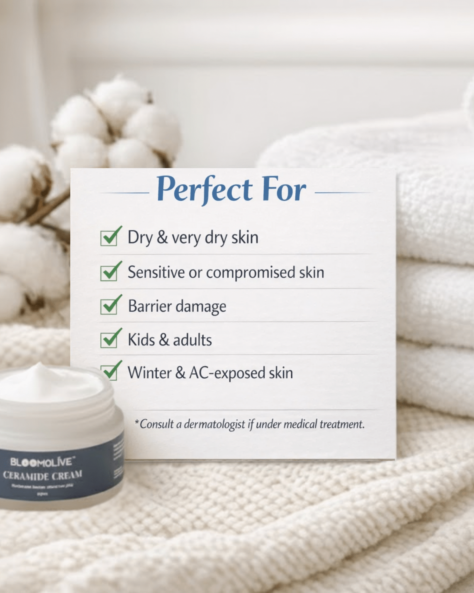 • Follow with Bloomolive – Ceramide cream for best results.